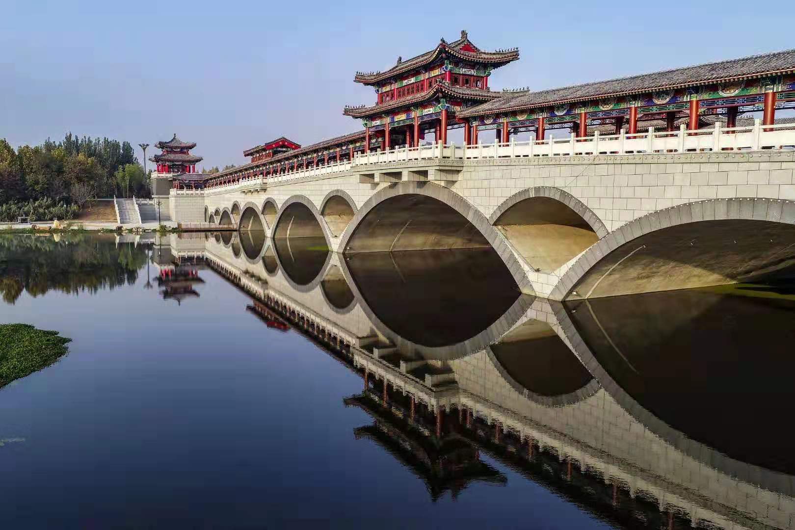 曲阜大沂河興華橋橋梁全長 183.2 米,寬 31.6 米,采用不等跨對稱九連孔板拱橋。在建筑風(fēng)格的選取上充 分結(jié)合周邊環(huán)境及文化內(nèi)涵 ,橋頭各設(shè)置一對鐘鼓樓,左鐘右鼓,跨中設(shè)置“觀川閣”,人行道覆有古典式廊亭, 橋梁結(jié)構(gòu)與造型建筑結(jié)合曲阜地域特色,融入優(yōu)秀傳統(tǒng)文化內(nèi)涵,體現(xiàn)了“古樸、典雅、大氣、人本”的風(fēng)格, 現(xiàn)成為曲阜市地標性建筑。
