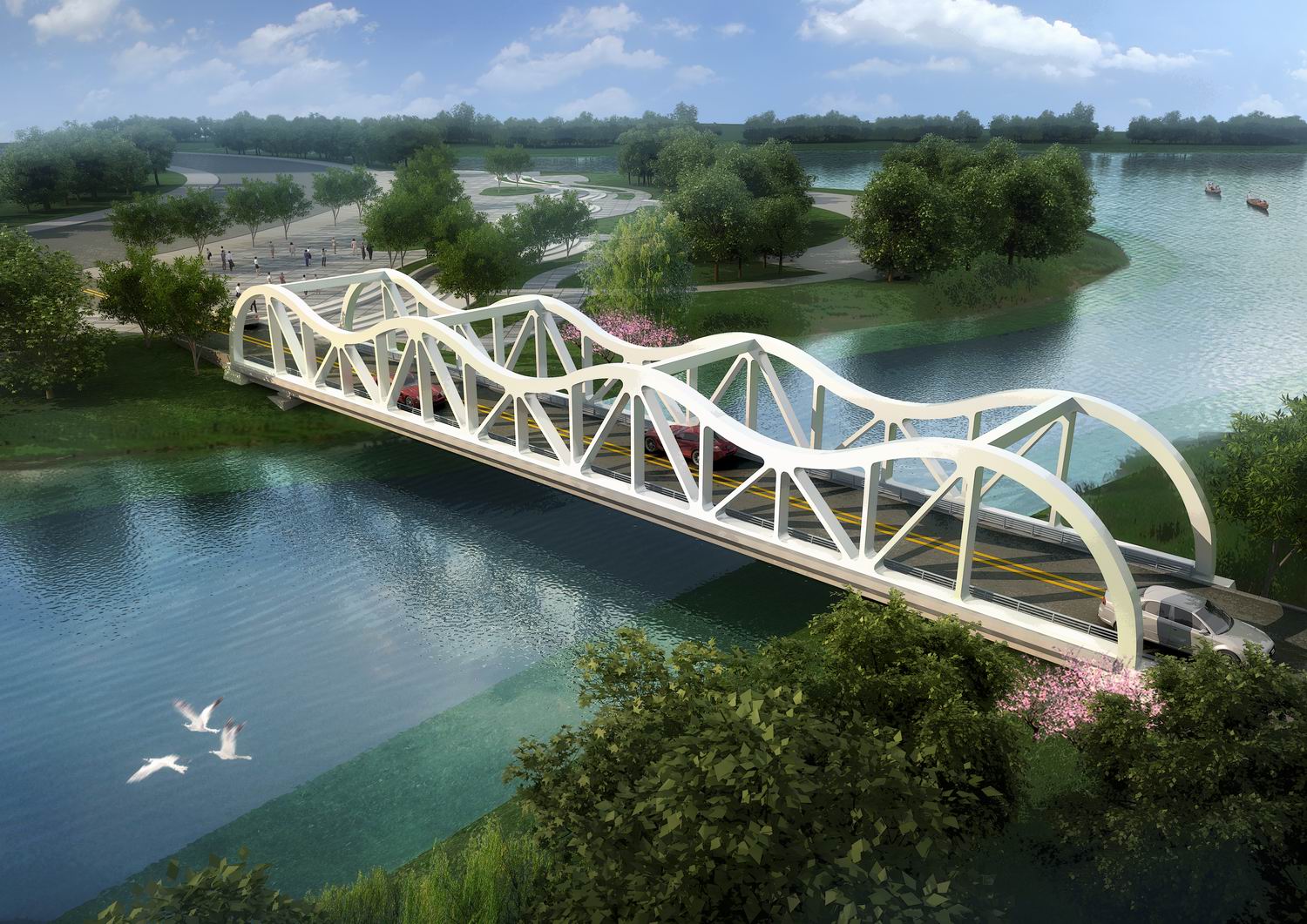 定陶汽車小鎮(zhèn)七座景觀橋工程,位于菏澤市定陶區(qū)東北側(cè),工程包括七座橋梁設(shè)計:園區(qū)一路橋梁一,長60米,寬40米;園區(qū)一路橋梁二,長39米,寬40米;園區(qū)二路橋梁,長48米,寬40米;園區(qū)三路橋梁,長39米,寬40米;園區(qū)五路橋梁,長104米,寬8米;園區(qū)六支路橋梁,長30米,寬24米;園區(qū)人行橋,長150米,寬3米。方案設(shè)計突出與汽車小鎮(zhèn)建設(shè)主題相融合,工程投資約6600萬元。